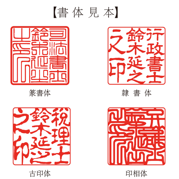 士業印には、歴史と権威に裏付けられた複数の選択肢があります。以下のいずれかの書体をお選びいただき、見本をご確認のうえ、あなたの職務にふさわしい一本をお作りください。