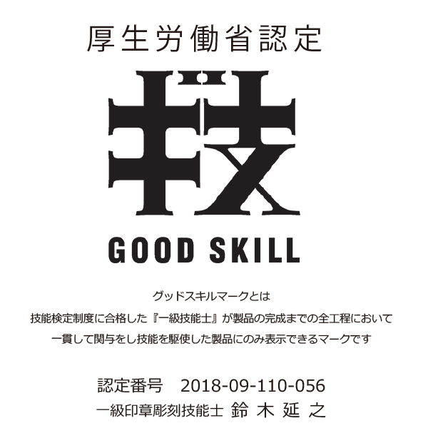 こちらの製品は一級技能士が一貫して製作に関与した証『グッドスキルマーク』を冠したシヤチハタ印です