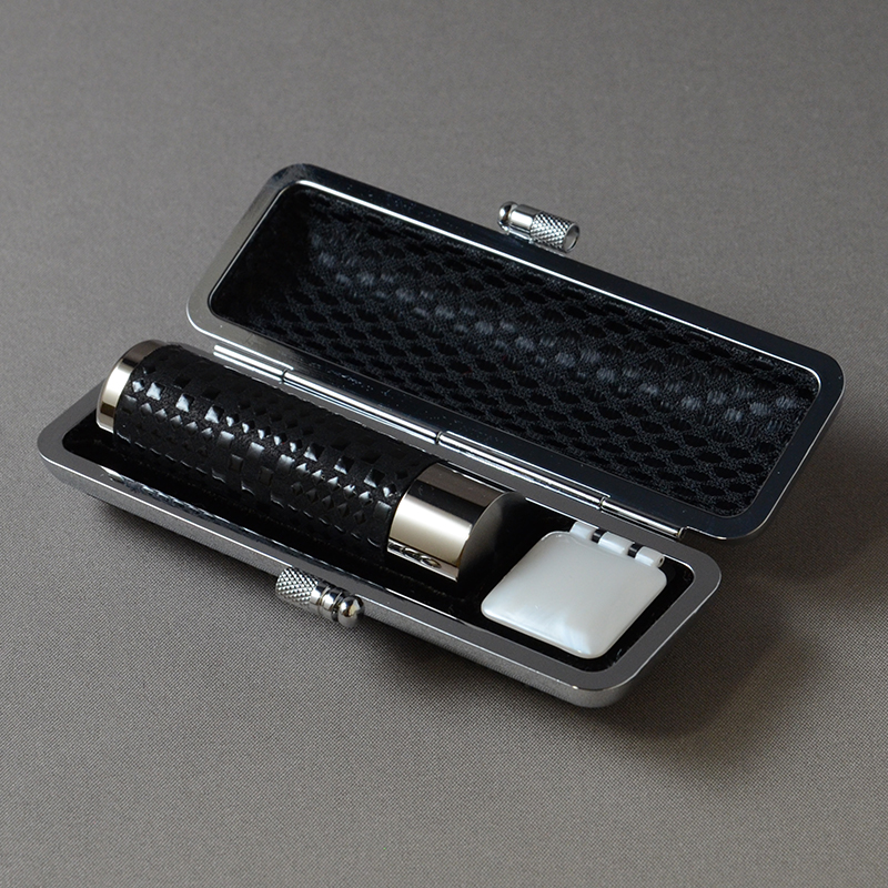 ケースは印材に合わせて表面に印伝黒一松を使用。内側はブラックの専用ケース付