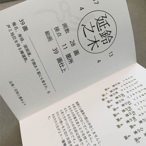 具体的には判下と呼ばれる下書きで接点を記し、専用の画数表にて総画数と意味をご用意致します。