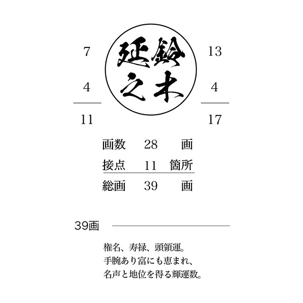 あなたのお名前の総画数を調べ、丸い枠に文字が付く箇所を接点とし、その合計で良い画数の印章にするサービスです。