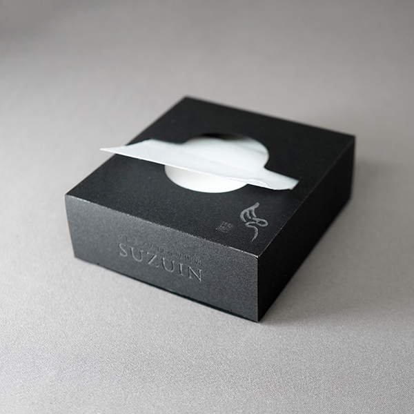 印章についた朱肉を素早く、確実に拭き取るための専用ペーパーです。携帯用でご好評いただいている上質な雰囲気を受け継ぎ、やや厚みのある艶消し黒の紙パッケージで仕上げました。卓上で使いやすいベースサイズを採用し、捺印の所作を美しく整える鈴印オリジナルです。